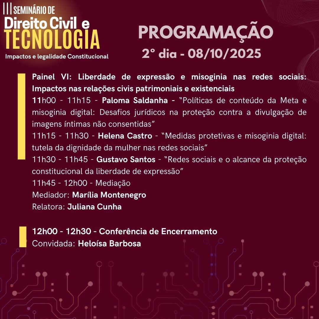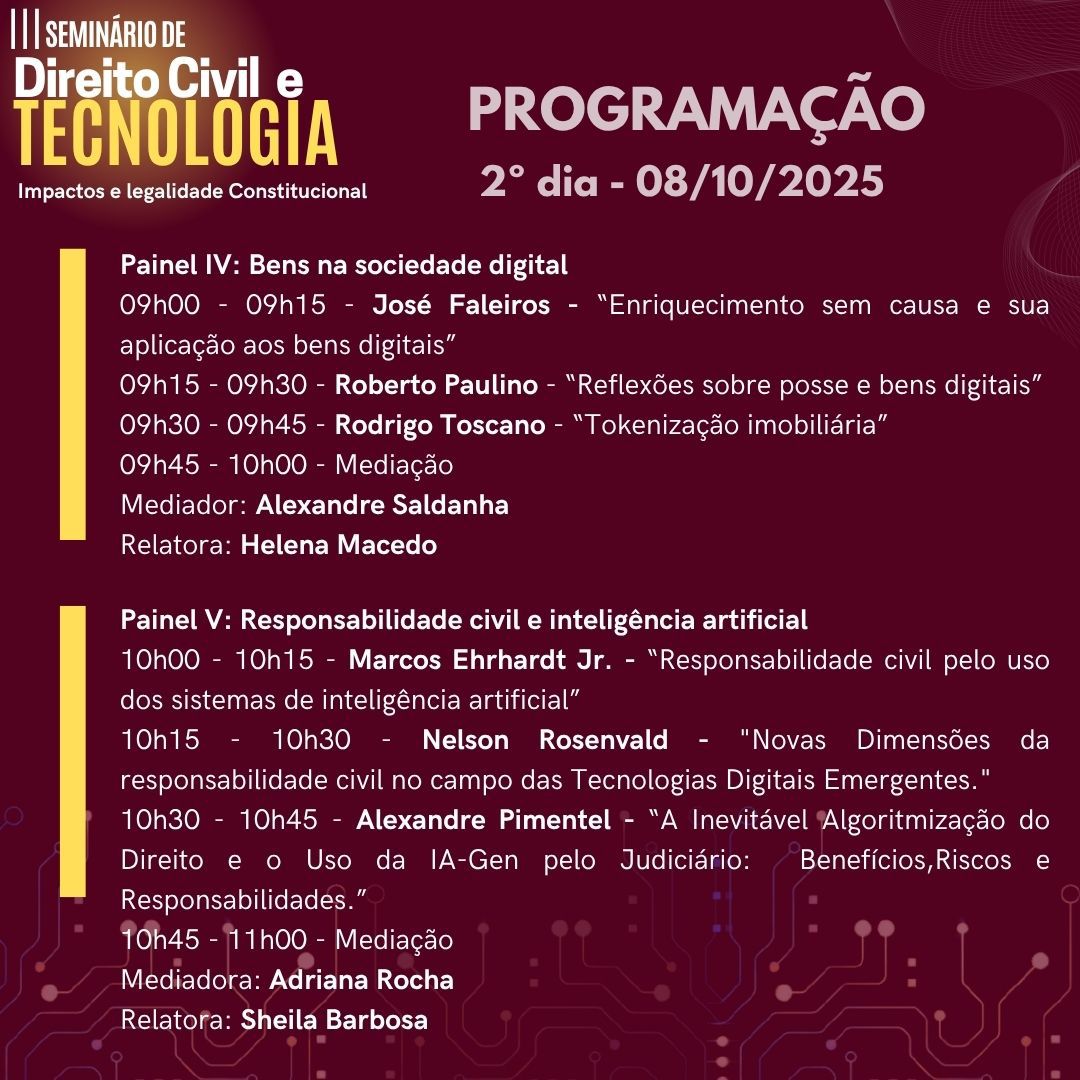 ?? A programação do III Seminário de Direito Civil e Tecnologia segue nesta quarta-feira (08/10).