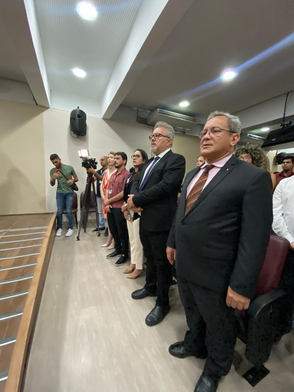 A solenidade – O homenageado Camilo Santana entrou acompanhado do coordenador do curso de Ciências da Religião, Prof. Dr. Luis Carlos de Lima Pacheco; da coordenadora do curso de História, Profª Drª Maria do Rosário da Silva; da coordenadora dos cursos de Física, Matemática e Química, Profª Drª Edjane Oliveira dos Santos Cavalcanti; da coordenadora dos cursos de Letras e Pedagogia, Profª Drª Flávia Tavares da Costa Ramos; e do coordenador do curso de Filosofia, Prof. Dr. Padre Marcos Gomes.