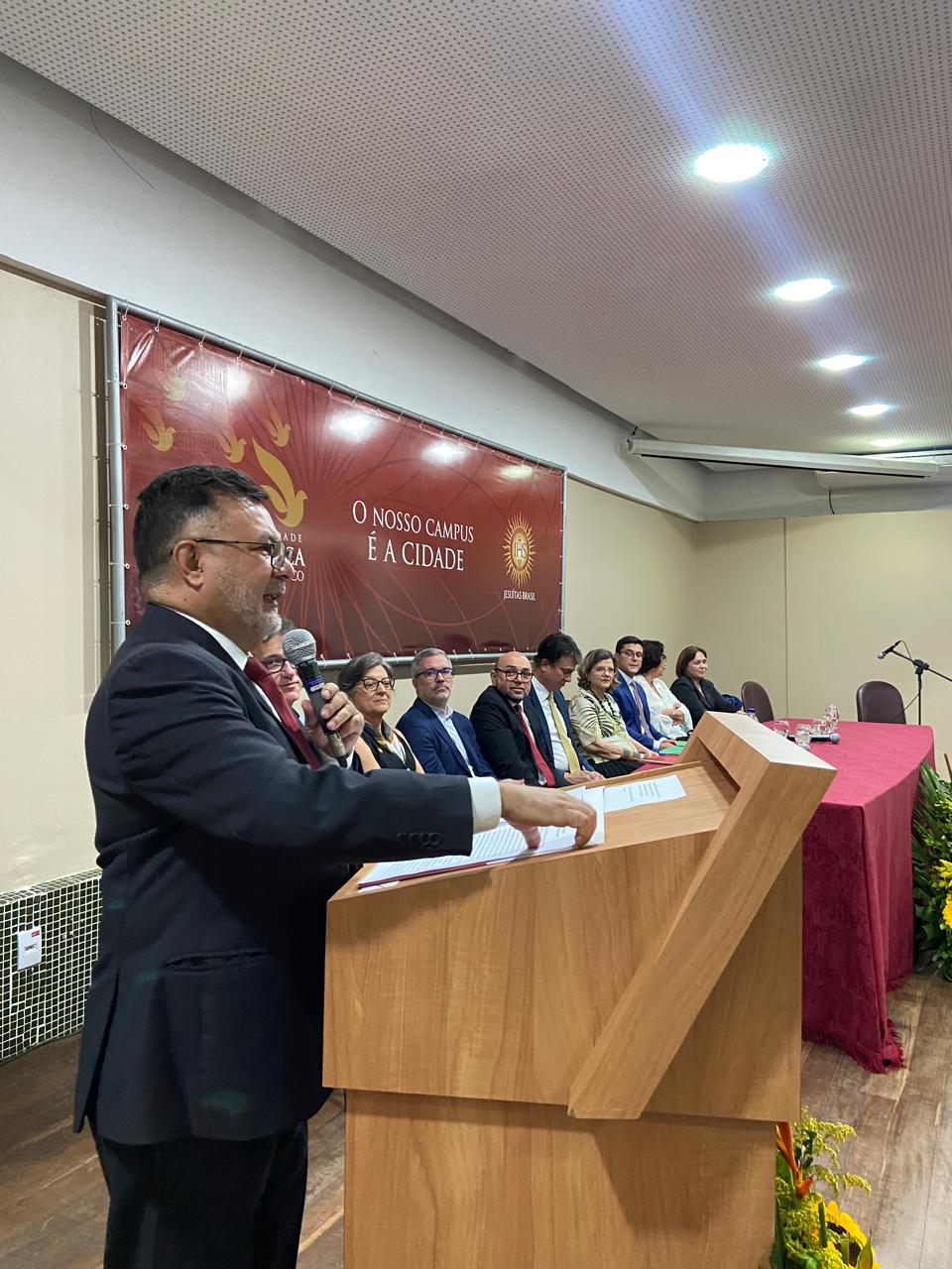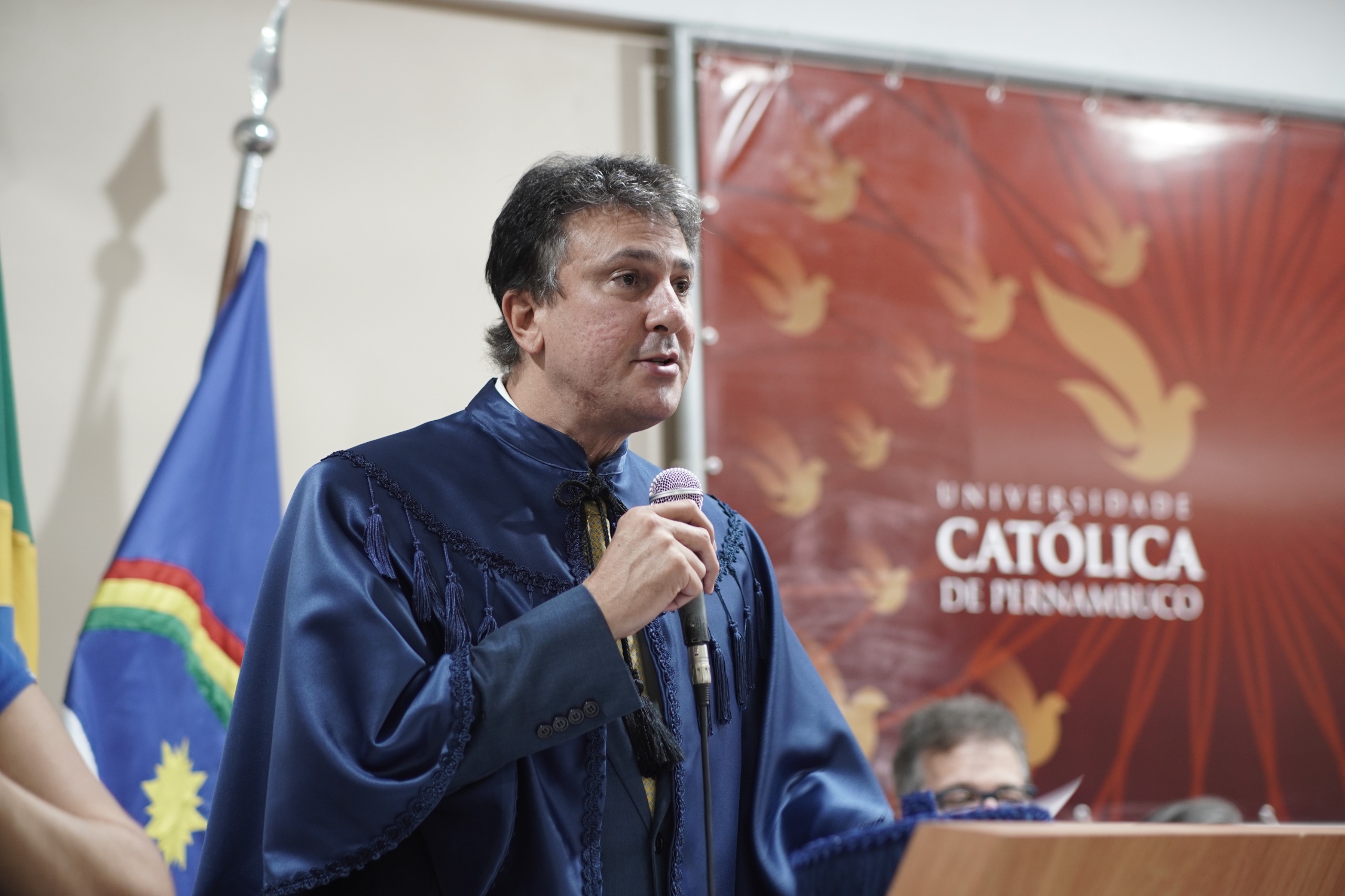 Na abertura da solenidade, o Reitor Padre Pedro Rubens destacou o significado institucional e simbólico do momento ao registrar a satisfação pessoal por concluir sua missão de 20 anos à frente da Reitoria com atos dessa natureza. Segundo ele, a Unicap reafirma, com a homenagem a Camilo Santana, a centralidade da articulação entre ensino, pesquisa, extensão e inovação, em diálogo permanente com o Ministério da Educação e o Ministério da Ciência, Tecnologia e Inovação. “Para a nossa região o momento histórico não poderia ser mais expressivo, pois Camilo e Luciana apoiam, participam e reforçam o projeto político liderado pelo nosso presidente Lula. Três nordestinos a serviço do Brasil”, disse ele relembrando que no dia anterior a honraria foi concedida à ministra Luciana Santos.