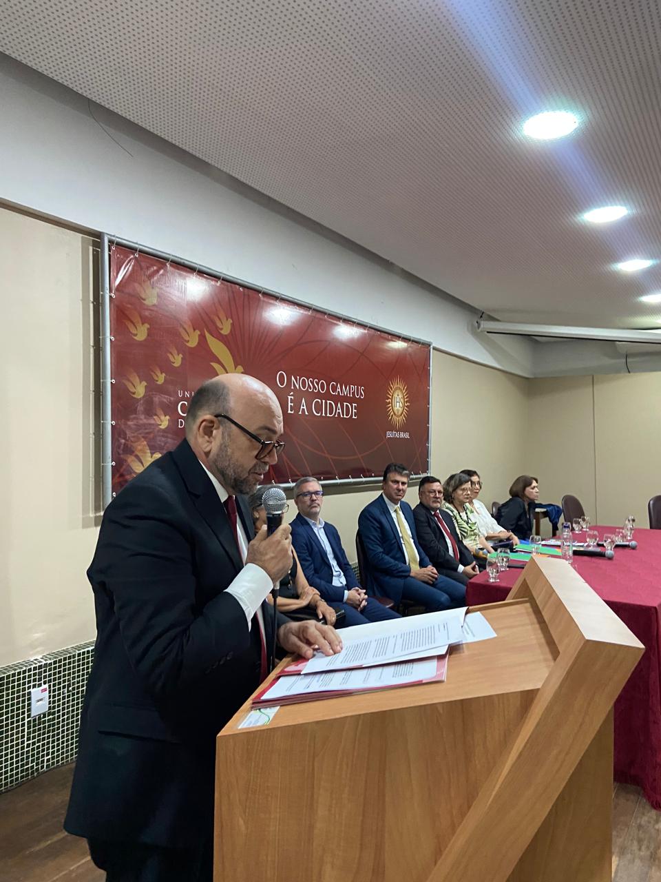 O panegírico do homenageado foi proferido pelo Pró-reitor de Graduação, Degislando Nóbrega, que ressaltou que o título de Doutor Honoris Causa “ultrapassa a cronologia de uma carreira e penetra o campo do legado”. Para ele, a trajetória de Camilo Santana se confunde com a história recente da educação cearense e brasileira, marcada por planejamento, diálogo e compromisso com a dignidade humana. “No parlamento, na administração pública e sobretudo como governador do Ceará, sua biografia se confundiu com a própria história recente da educação daquele estado”, afirmou.