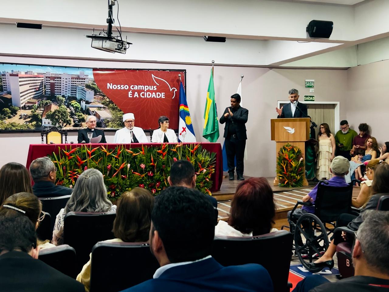 Ao final de seu discurso, Padre Carlos Fritzen citou Guimarães Rosa, convocando todos a terem coragem para inovar e incluir, reafirmando seu compromisso com uma Unicap que seja verdadeiramente católica e pernambucana, mas com uma alma universal.