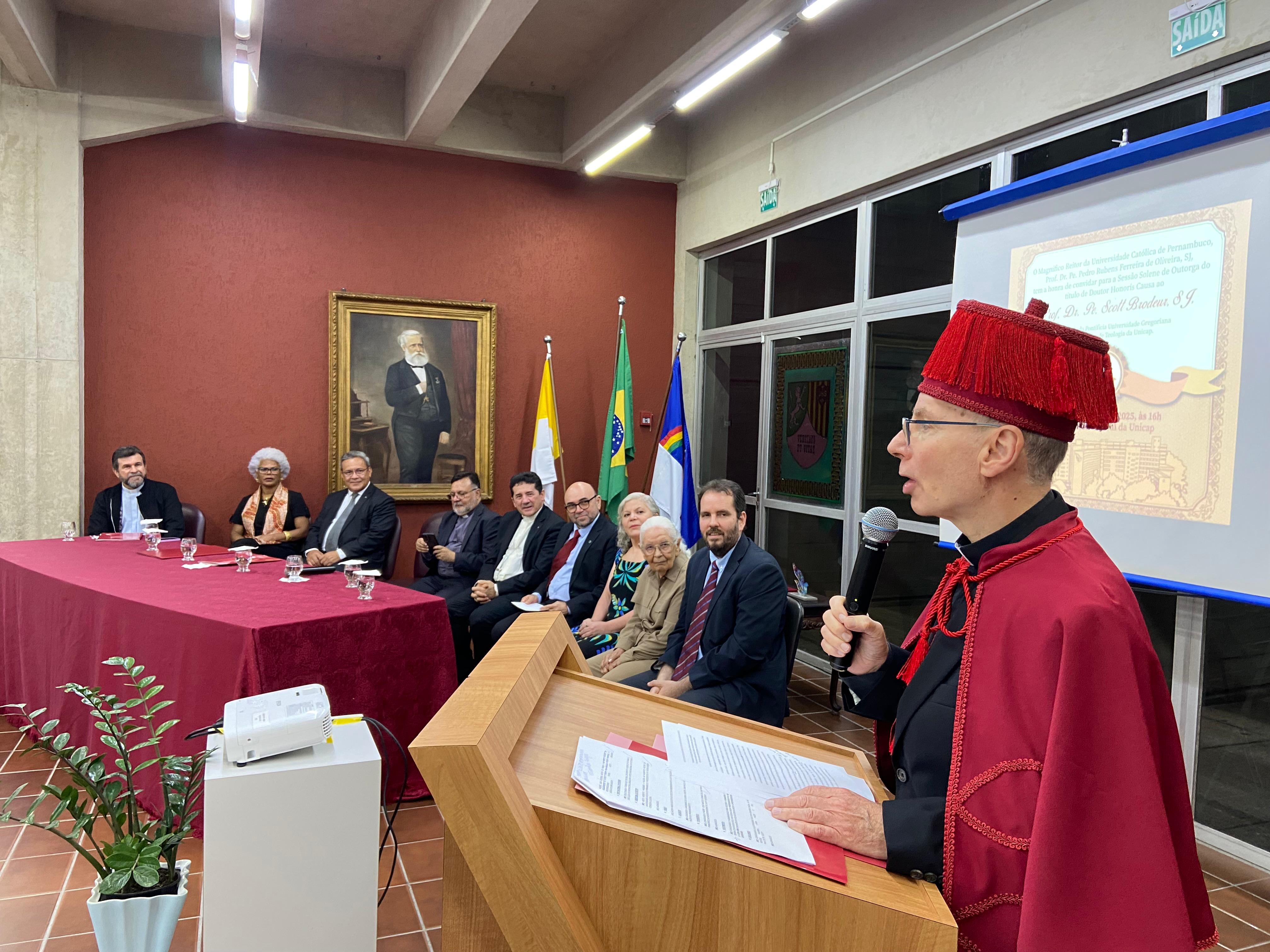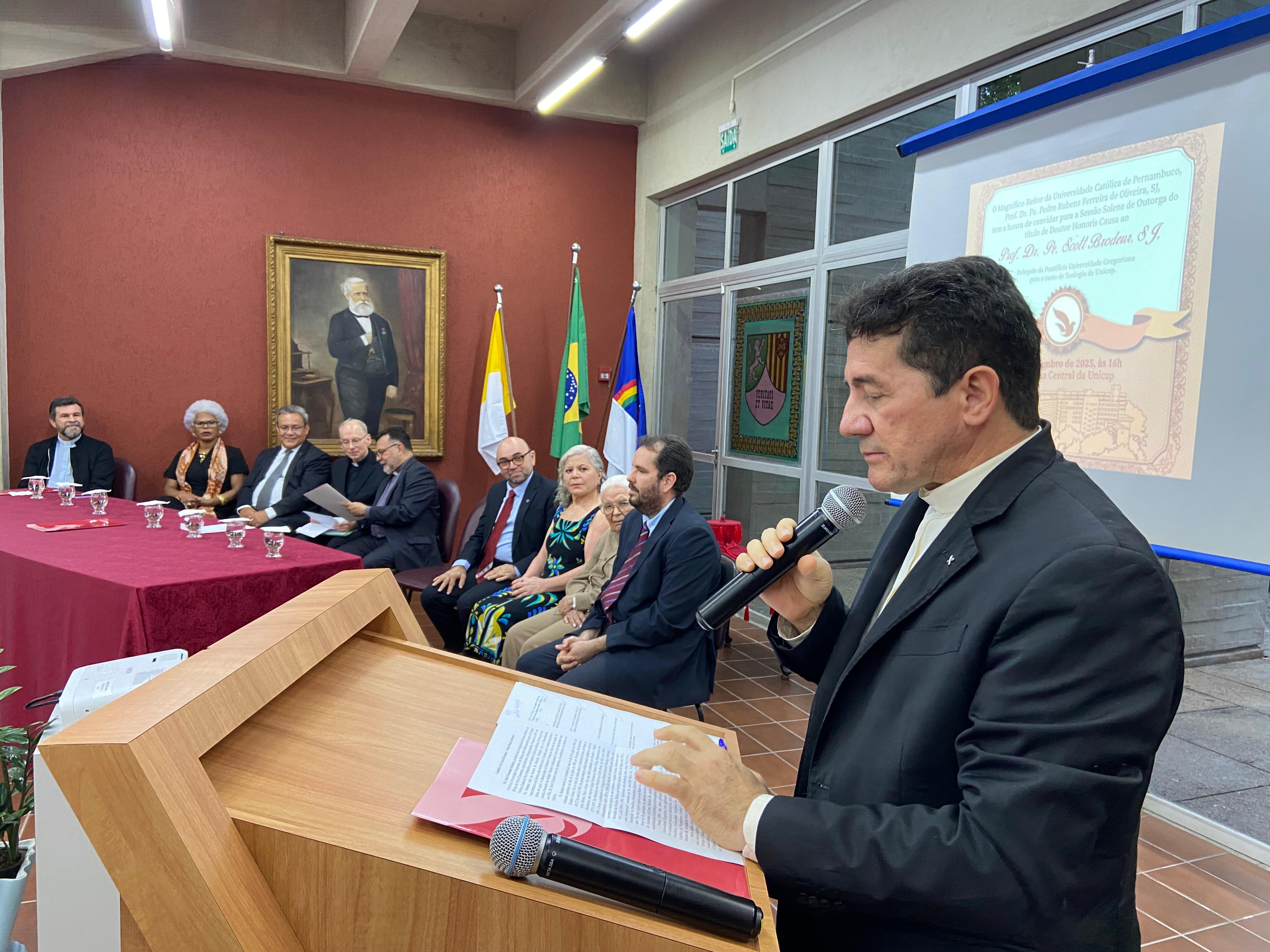 Na tarde desta quinta-feira (27), a Universidade Católica de Pernambuco (Unicap) concedeu o título de Doutor Honoris Causa ao Padre Scott Brodeur, jesuíta norte-americano reconhecido por sua contribuição à teologia e ao diálogo inter-religioso. A cerimônia, realizada na Biblioteca da Unicap, reuniu autoridades acadêmicas, professores, estudantes e convidados em um momento marcado pela emoção e pela reflexão.
