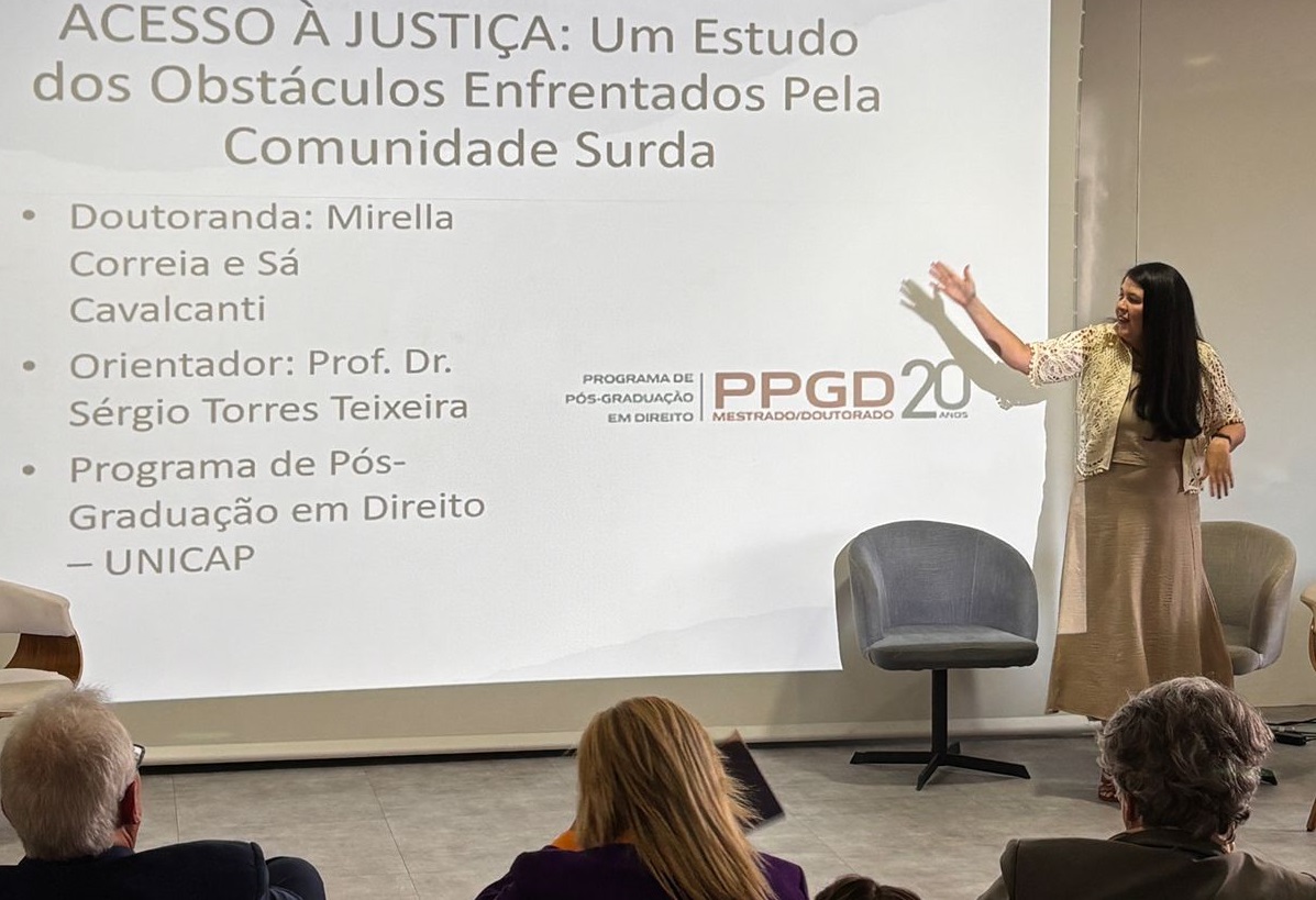 Sob orientação do Prof. Dr. Sérgio Torres Teixeira e coorientação da Profª Drª Flora Oliveira da Costa, a pesquisadora defendeu a tese intitulada “Acesso à Justiça: Um Estudo dos Obstáculos Enfrentados pela Comunidade Surda”. O trabalho faz uma revisão crítica dos principais documentos jurídico-normativos que garantem o direito de acesso à Justiça às pessoas surdas usuárias de Libras e realiza um exame empírico das barreiras enfrentadas por essa população no sistema judiciário brasileiro.