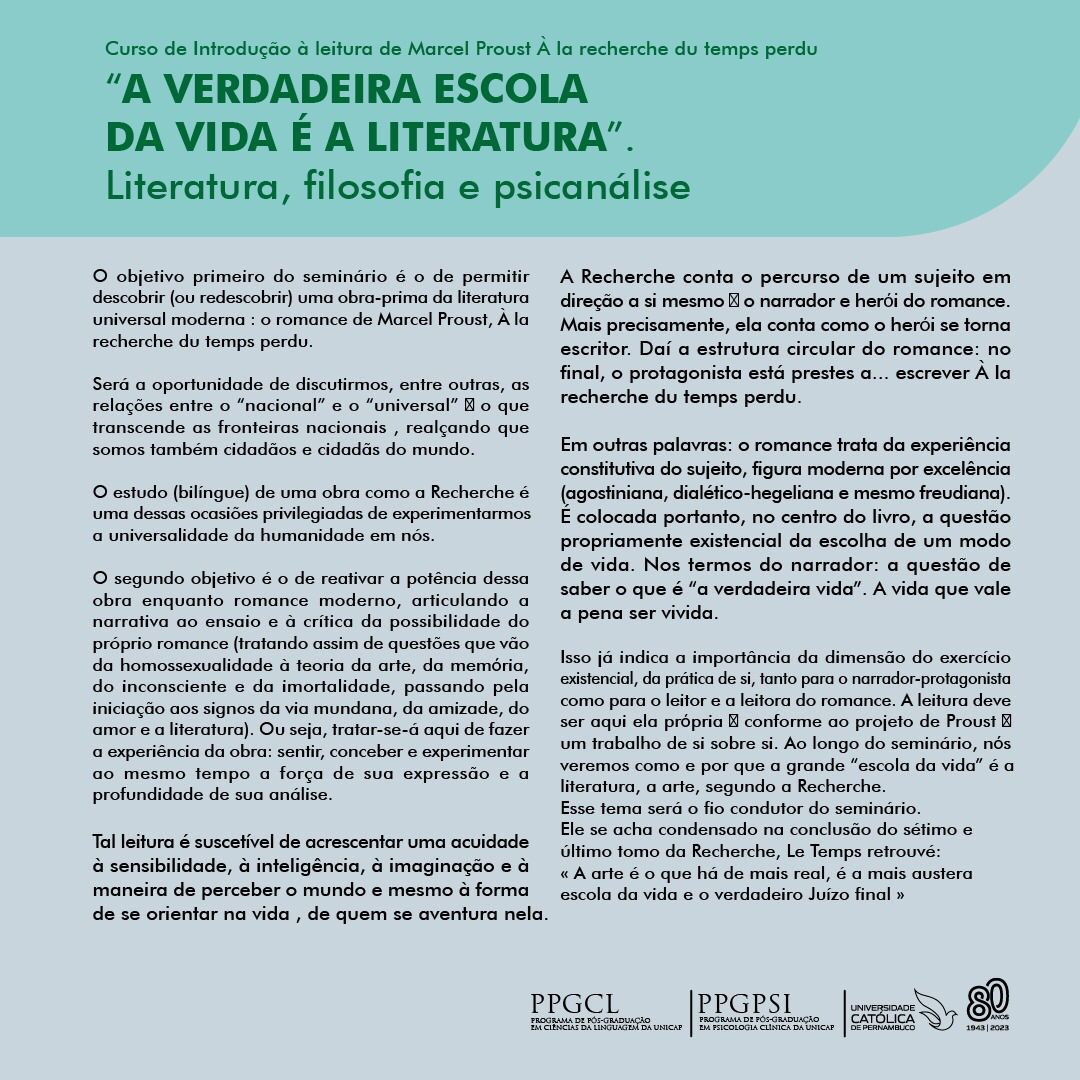O Programa de Pós-graduação em Psicologia Clínica e o Programa de Pós-graduação em Ciências da Linguagem estão promovendo o Seminário: "A Verdadeira Escola da Vida é a Literatura" - Prof. Dr. Plínio Prado (Universidade Paris 8).
