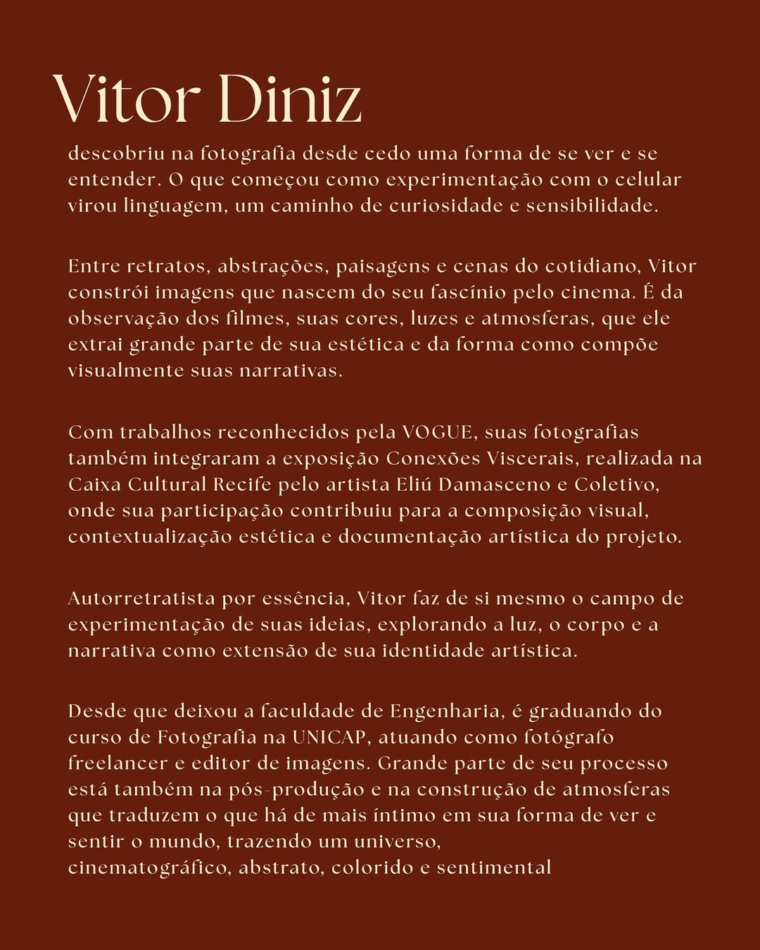 Em sintonia com o realismo mágico, Vitor transforma o ato de se ver e ver o outro em narrativa poética: Onde cada rosto revela mais do que mostra.