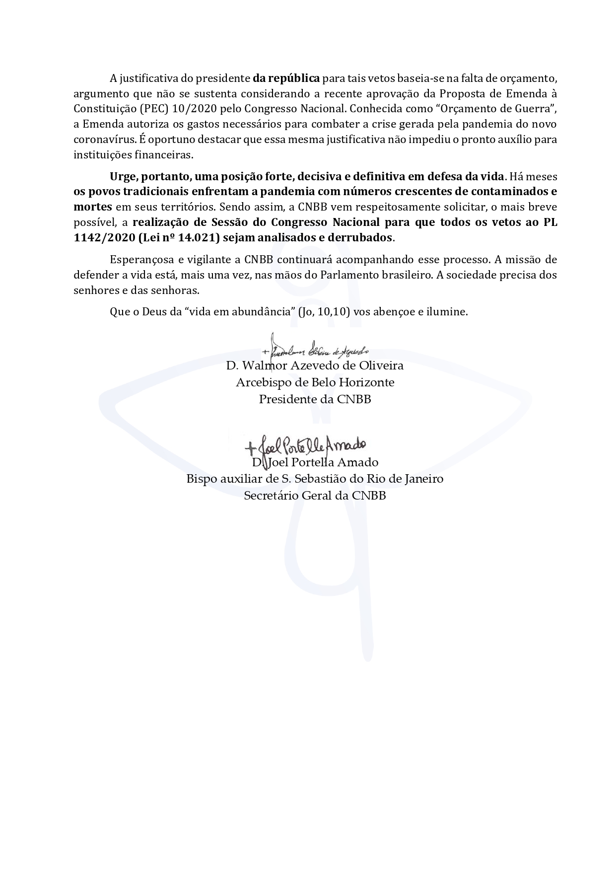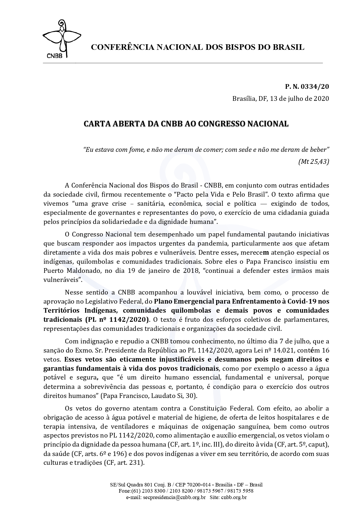 CARTA ABERTA DA CNBB AO CONGRESSO NACIONAL – Brasília, DF, 13 de julho de 2020 - Unicap